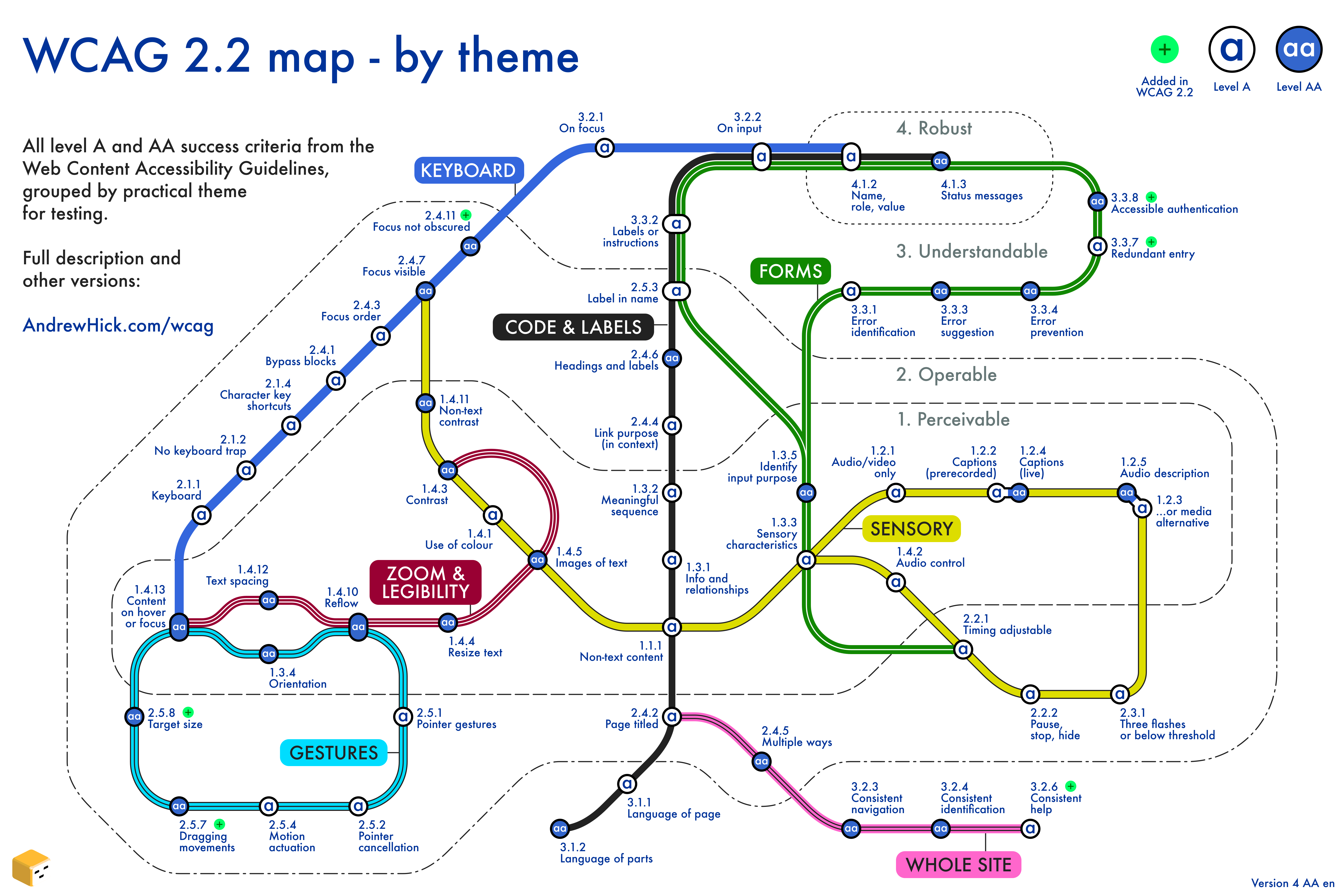 Each station marker shows whether a criterion is level A or AA. The 4 WCAG principles are depicted as zones moving outwards from the centre using dotted lines: